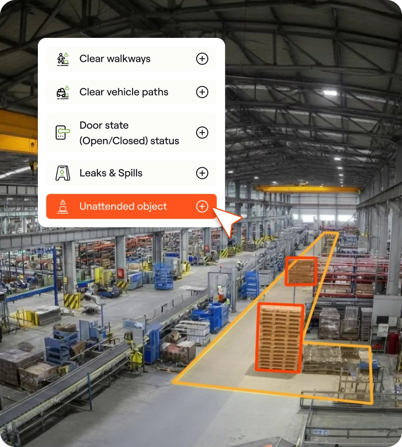 Set custom rules for clear walkways, spill detection, and object placement to match your site’s safety standards.